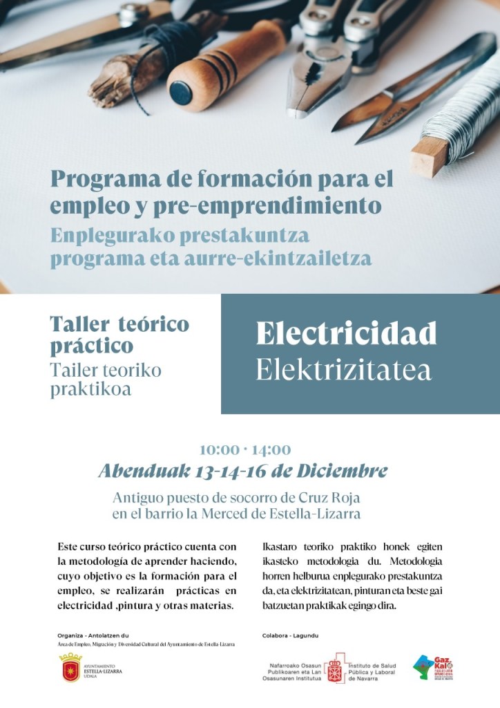El Área de Empleo, Migración y Diversidad Cultural del Ayuntamiento de Estella-Lizarra ha organizado para los días 13, 14 y 16 de diciembre un taller teórico práctico de electricidad en el barrio de La Merced, en el antiguo puesto de socorro de Cruz Roja.