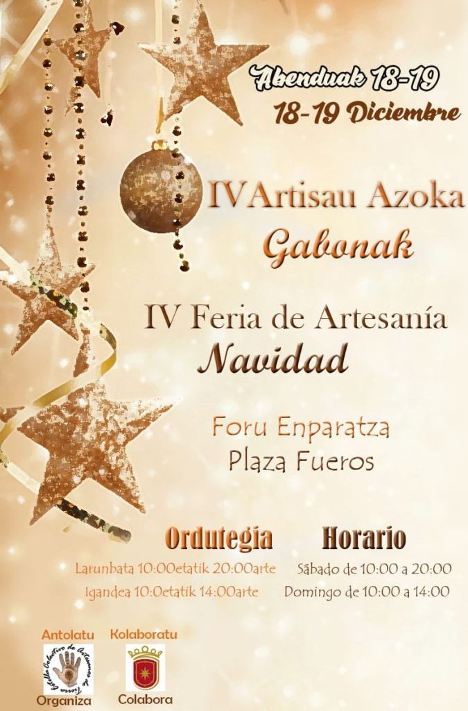 Este fin de semana la Plaza de los Fueros, será el escenario de la cuarta edición de la Feria de Artesanía que organiza el Ayuntamiento de Estella-Lizarra. La feria se desarrollará tanto durante la jornada del sábado como la del domingo, aunque con distintos horarios. El sábado abrirá sus puertas a las 10 de la mañana para cerrarlas a las 20 h, mientras que el domingo el horario será matutino, de 10 a 14 h.