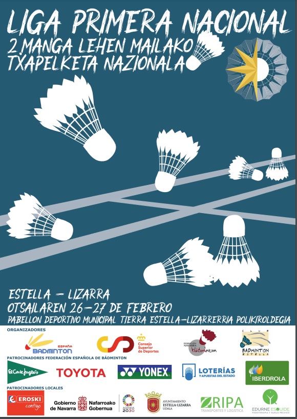 Esta jornada de Liga Nacional se celebrará gracias a la organización de la Federación Española de Bádminton, Federación Navarra de Bádminton, Club Bádminton Estella y Consejo Superior de Deportes; el patrocinio de Excelentísimo Ayuntamiento de Estella – Lizarra y Gobierno de Navarra; y la colaboración de Iberdrola, Toyota, Yonex, El Corte Inglés, Loterías y apuestas del Estado, Transportes y Logística Ripa, Edurne Esquide Fisioterapia y Eroski.
