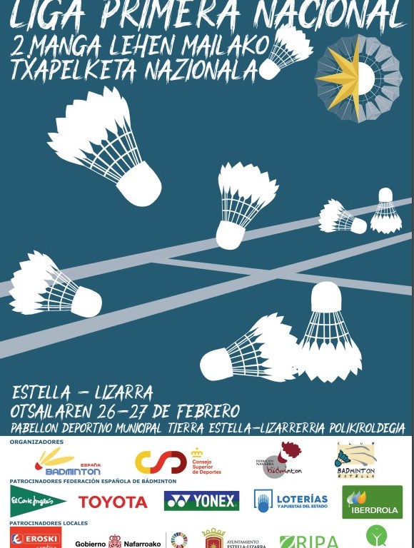 Esta jornada de Liga Nacional se celebrará gracias a la organización de la Federación Española de Bádminton, Federación Navarra de Bádminton, Club Bádminton Estella y Consejo Superior de Deportes; el patrocinio de Excelentísimo Ayuntamiento de Estella – Lizarra y Gobierno de Navarra; y la colaboración de Iberdrola, Toyota, Yonex, El Corte Inglés, Loterías y apuestas del Estado, Transportes y Logística Ripa, Edurne Esquide Fisioterapia y Eroski.