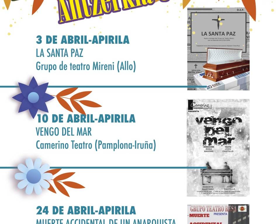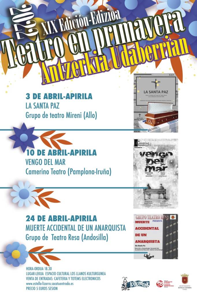 Se trata de la XIX edición de las Jornadas de Teatro en Primavera que organiza el Grupo de Teatro Kilkarrak, en colaboración con el Ayuntamiento de Estella-Lizarra. La programación incluye cuatro representaciones de compañías amateur, que se subirán al escenario del Espacio Cultural Los Llanos, los días, 3, 10 y 24 de abril.
