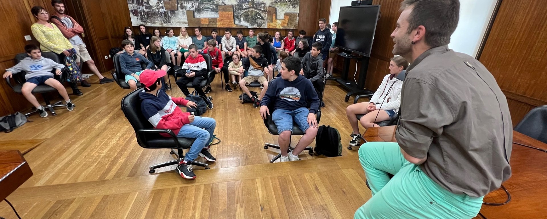 Además, esta mañana han sido recibidos en el salón de plenos del Ayuntamiento por el alcalde, Koldo Leoz Garciandia, y el concejal Regino Etxabe Díaz. Durante unos minutos, Leoz les ha explicado, también en euskera los vínculos históricos y culturales que unen a ambas localidades, y les ha recordado que en breve, el día de la Virgen del Puy, la Corporación municipal de Donibane Garazi visitará Estella-Lizarra. También ha hecho mención al mural de Pedro Irulegui que adorna el salón con referencias a ambos municipios.