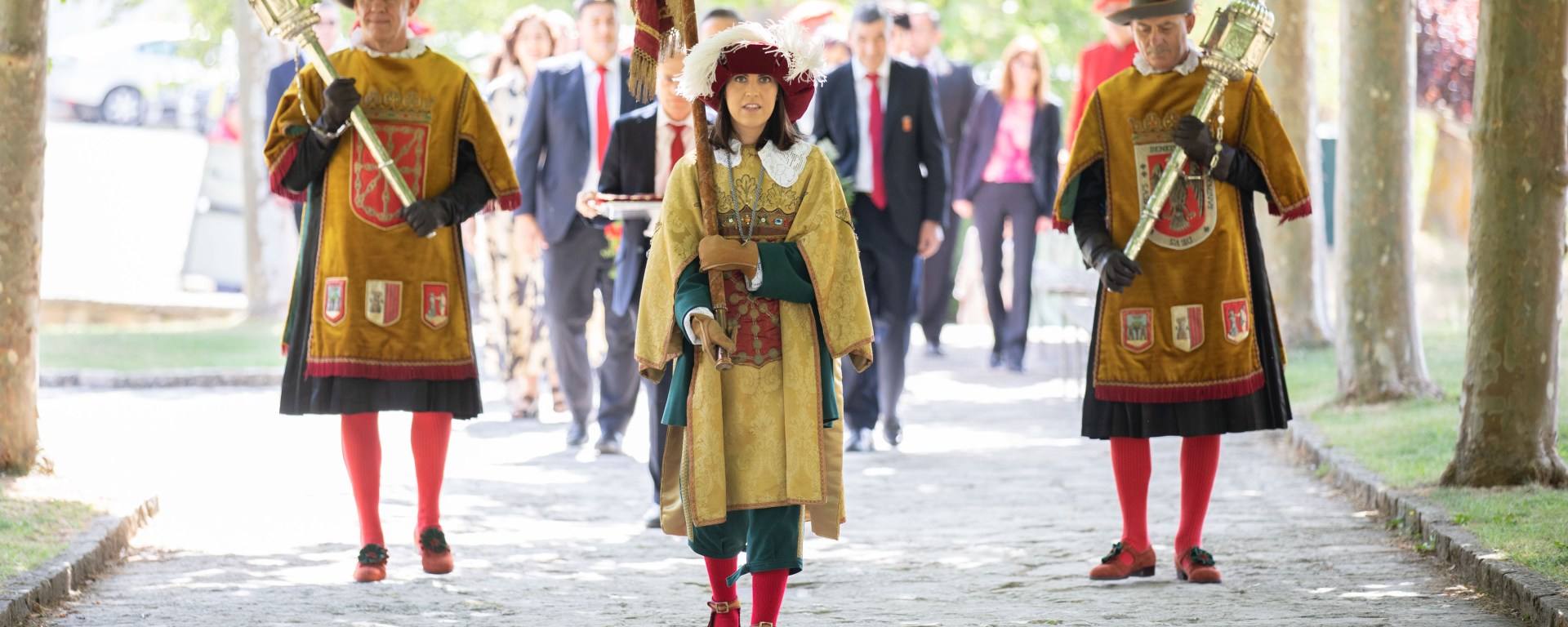 El acto, de carácter civil, ha dado comienzo con un recorrido por el recinto del monasterio del cortejo oficial, precedido por los ujieres que portaban la corona de flores y los objetos de la ofrenda, maceros, rey de armas, y seguido por las autoridades: la Presidenta Chivite, el presidente del Parlamento, Unai Hualde, y las consejeras y consejeros del Ejecutivo foral. Mientras avanzaba la comitivia, la Banda de Trompetas y Timbales del Gobierno ha interpretado el Himno de Navarra, Marcha para la entrada del Reyno.