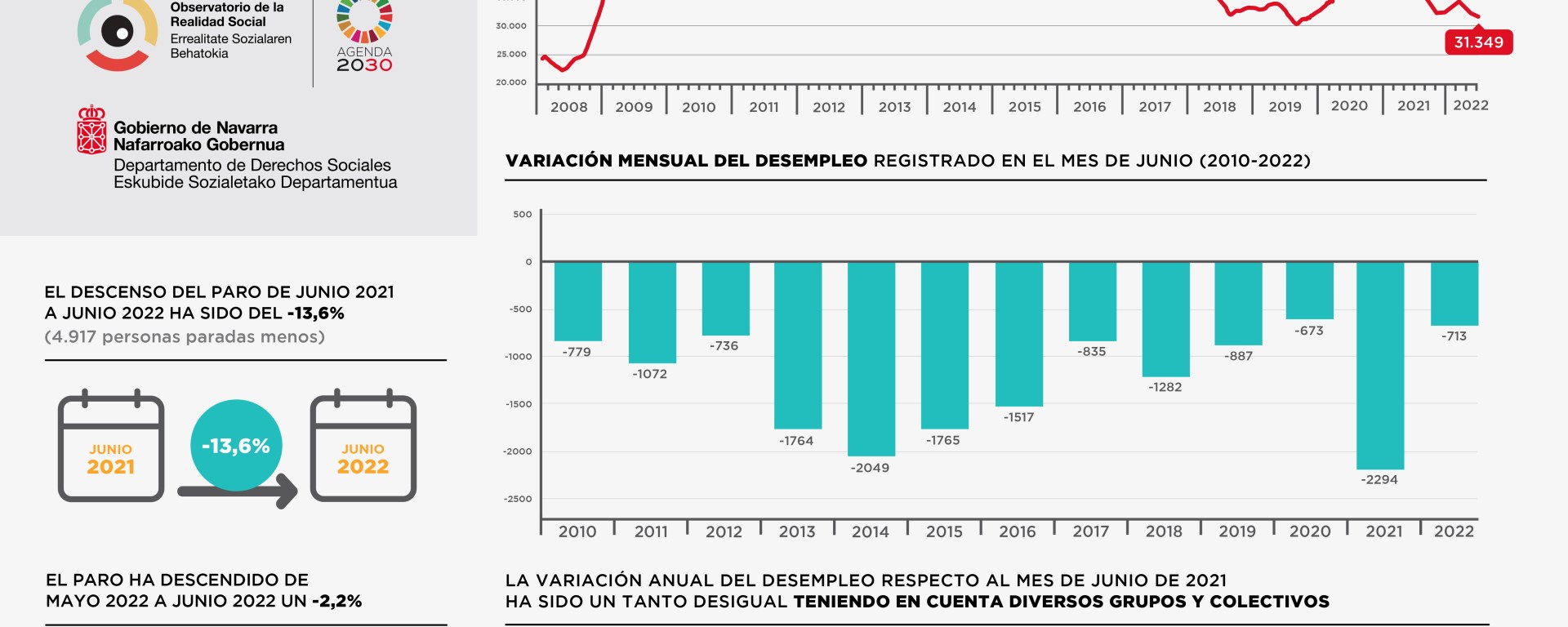 El resumen de cifras el terminar junio es de 31.349 personas en desempleo. El número de contratos realizados en el mes ha sido de 32.374 y las afiliaciones medias suman 301.137, según los datos aportados por el Observatorio de la Realidad Social.