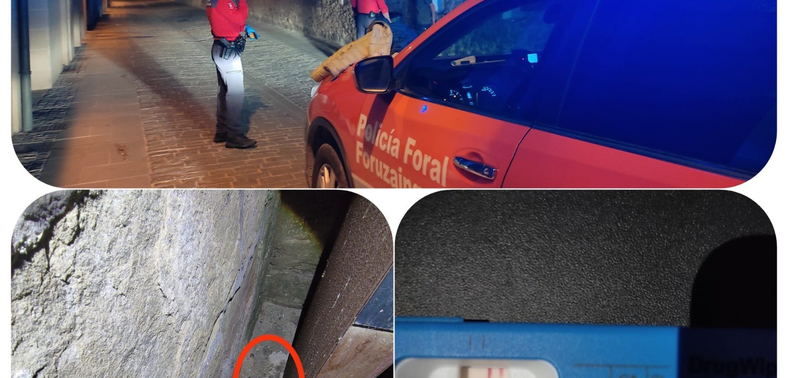 La otra patrulla localizó el turismo fugado 260 metros de donde se encontraban los dos hombres y cuya titularidad correspondía a uno de ellos. En su interior había una bolsa con una sustancia estupefaciente y restos de consumo por gran parte del vehículo. El implicado daba manifestaciones contradictorias como que no conducía ya que carecía de permiso, que su coche se lo había cogido un amigo al que no quería identificar o que no quería atropellar al agente. Uno de los policías recorrió a pie la zona localizando las llaves del vehículo a 120 metros de donde se encontraban. En ese momento, admitió que era él el que conducía. En las pruebas de drogas realizadas, arrojó positivo en anfetaminas, cocaína y THC.