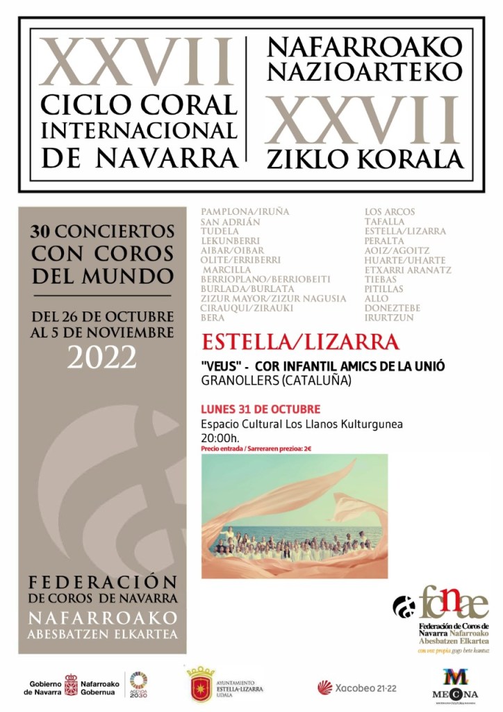 El lunes, día 31 de octubre, le tocará el turno al Coro VEUS de Granollers (20.00 h, 2 euros), una cita enmarcada dentro del XXVII Ciclo Coral Internacional de Navarra que organiza la Federación Navarra de Coros con los ayuntamientos.
