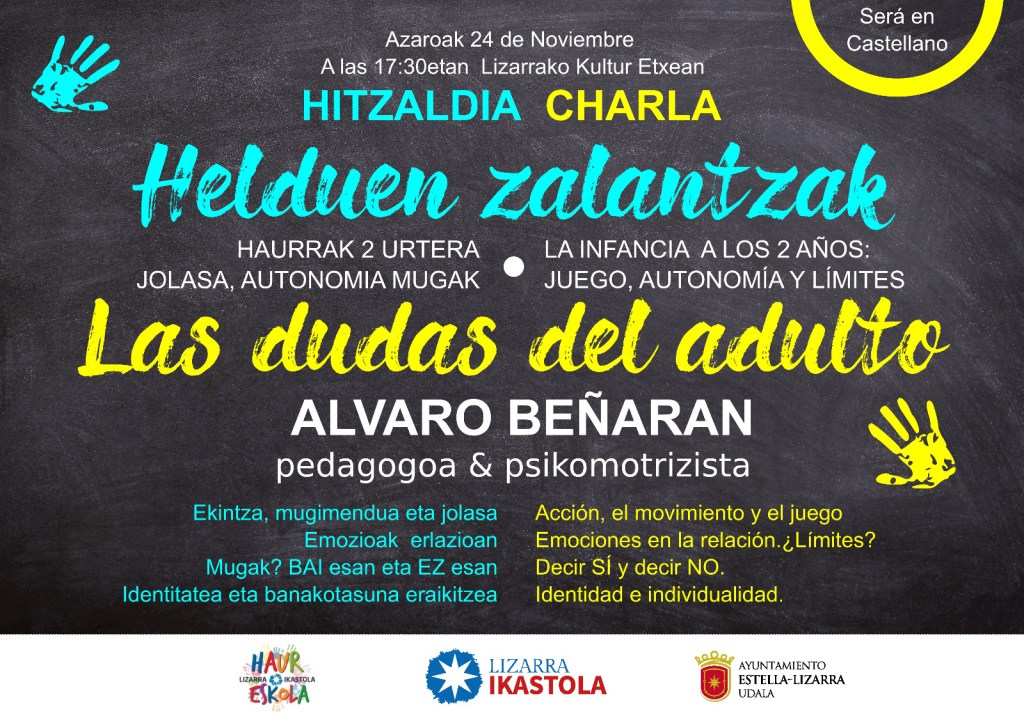 Lizarra Ikastola ha organizado una charla para las familias que tienen hijos/as de alrededor de los dos años. El Pedagogo y psicomotricista Álvaro Beñaran tratará las dudas del adulto en referencia a la educación de los más pequeños de las casa.