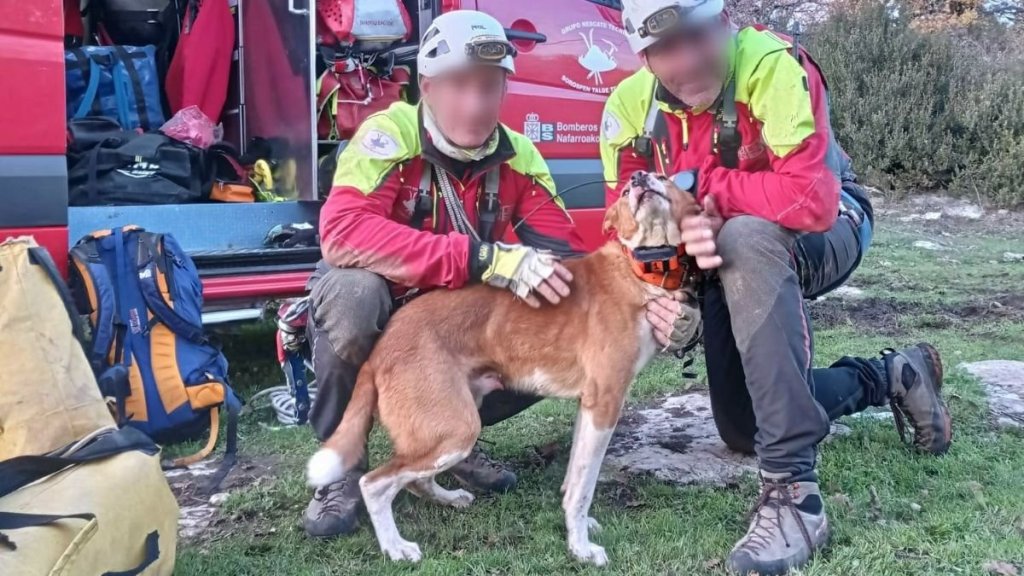 Bomberos del parque de Estella han rescatado este sábado por la mañana a un perro de caza que había caído en una sima de galerías estrechas y a unos 40 metros de profundidad en el alto de Guembe (Munárriz).