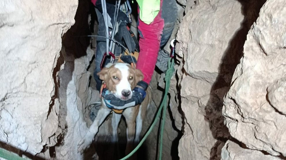 Bomberos del parque de Estella han rescatado este sábado por la mañana a un perro de caza que había caído en una sima de galerías estrechas y a unos 40 metros de profundidad en el alto de Guembe (Munárriz).