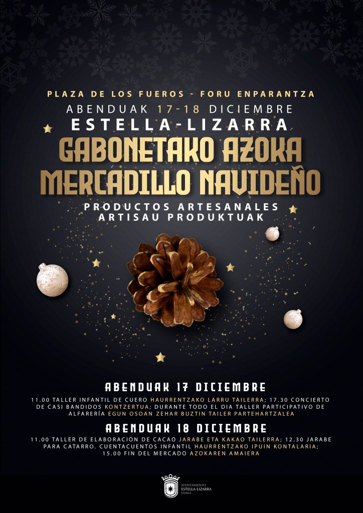La Plaza de los Fueros, acogerá este fin de semana un mercado navideño artesano que contará con diversas actividades como talleres de alfarería, cuero y de elaboración de cacao, cuentacuentos y conciertos. De esta manera el sábado a las 11 tendrá lugar un taller infantil de cuero y el domingo uno de elaboración de cacao. En el apartado musical se han programado dos conciertos, el primero para la tarde del sábado (17:30h), con «De casi bandidos» y el domingo al mediodía (12:30h) con «Jarabe para catarro».