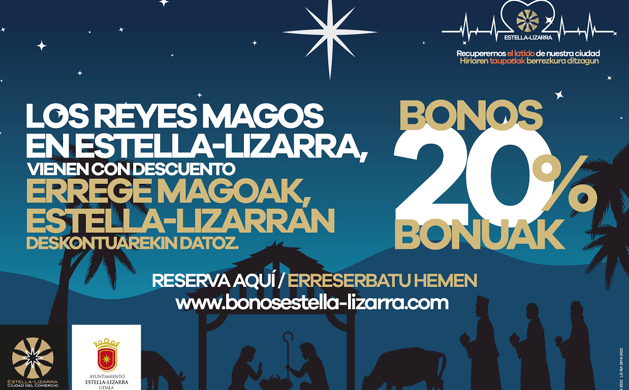 En este año, la Asociación ha decidido apostar por una campaña de bonos, que hemos denominado: “Los Reyes Magos en Estella-Lizarra, vienen con descuento”. Bonos con el 20% de descuento.