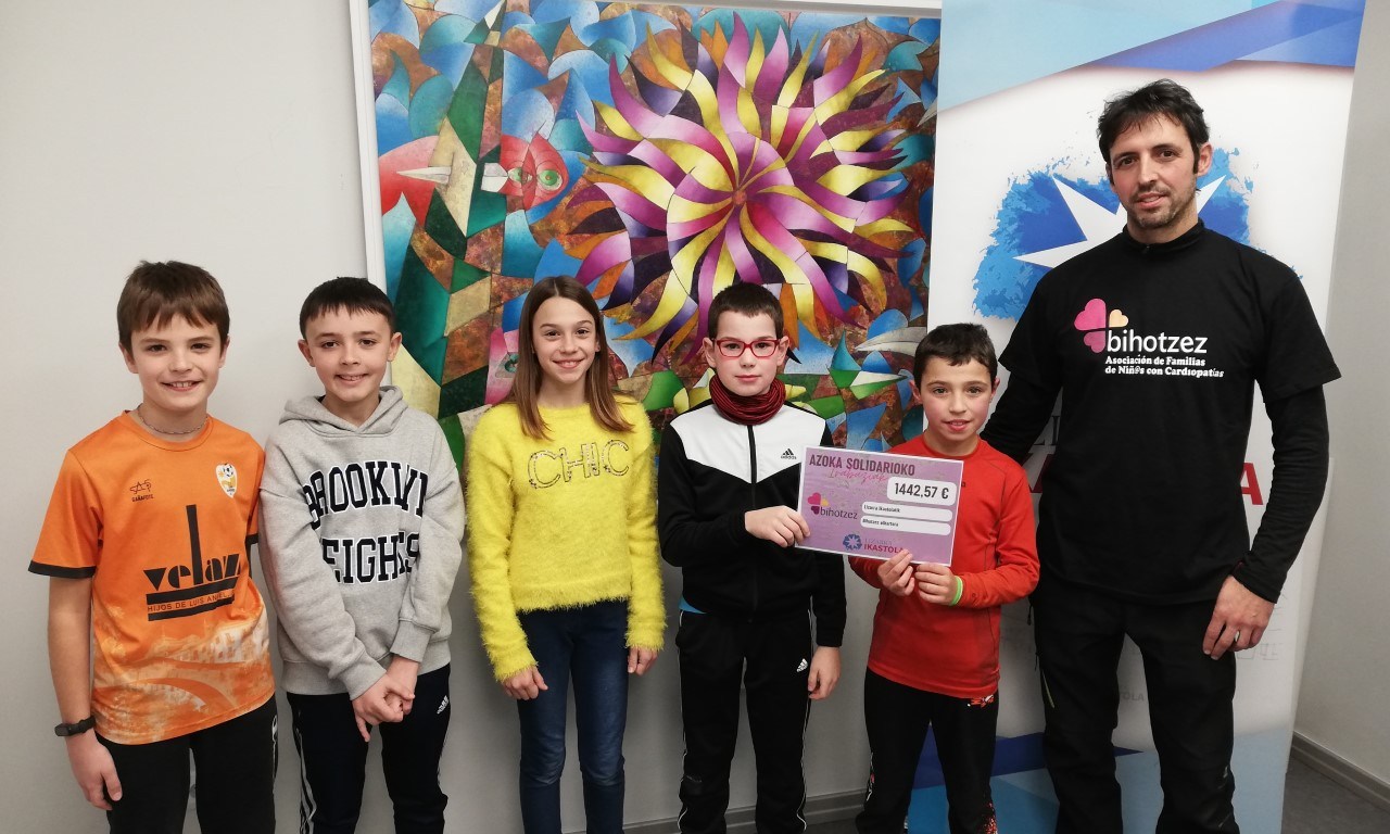 El esfuerzo ha merecido la pena ya que han conseguido recaudar exactamente 1442 euros para la asociación sin ánimo de lucro ‘Bihotzez’ que trabaja con el objetivo de mejorar la calidad de vida de las personas con cardiopatías congénitas y sus familias de Navarra y Euskadi. Los alumnos de 6º de Educación Primaria Hugo Tabar, Aimar Berruete, Lorea Bergera y Iraitz Arrastia, en nombre de todo el alumnado de sexto, han hecho entrega de la recaudación obtenida a Pedro Gómez y Peio Gómez, socios de ‘Bihotzez’ y representantes en este caso de la asociación.