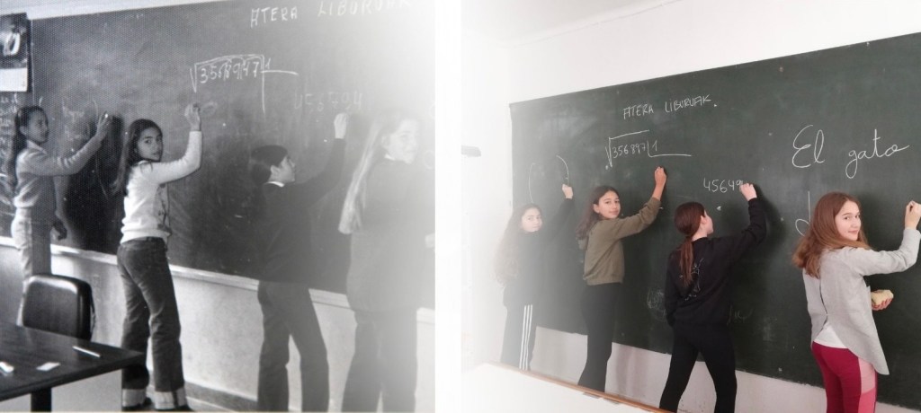 Lizarra Ikastola dio sus primeros pasos en el Frontón de Estella-Lizarra hace más de 50 años, edificio con el que siempre hemos mantenido una estrecha relación. En breve se procederá a la demolición del edificio y a la ejecución del proyecto de otro espacio deportivo de grandes dimensiones. Antes de que esto ocurra, simbólicamente, hemos querido dejar nuestra huella en un espacio tan importante. Es por ello que hemos repetido con los alumnos de hoy fotos del pasado, enlazando pasado y presente de un mismo centro para siempre.