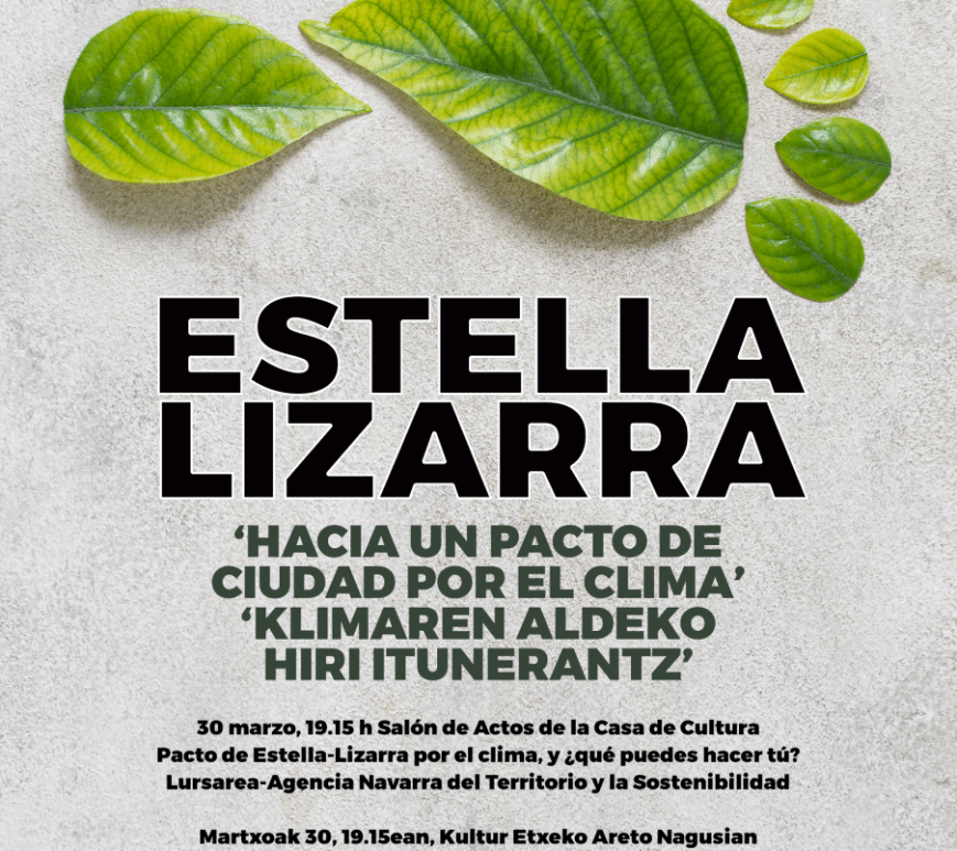 La periodista de ‘RNE3’ María José Parejo y el actor Patxi Bisquert ejercerán de madrina y padrino del acto, que tendrá continuidad por la tarde con una conferencia abierta a toda la ciudadanía El próximo viernes 31 de marzo se ha programado la firma oficial, en el salón de plenos del ayuntamiento, del pacto de Estella-Lizarra por el clima, un documento por el que el … Continúa leyendo El viernes se firma el Pacto de Estella-Lizarra por el clima