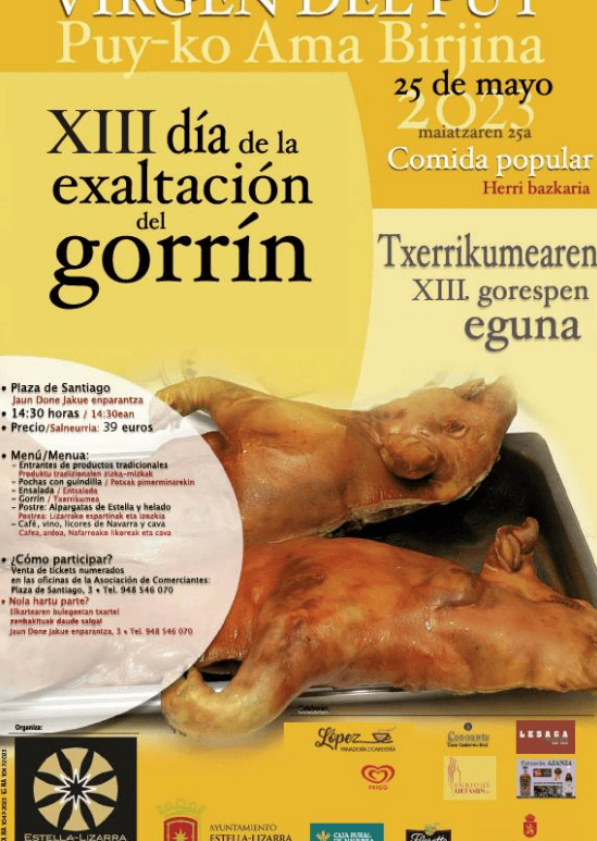 Desde la Asociación de Comerciantes, Hostelería y Servicios de Estella-Lizarra, se está preparando un año más una nueva edición, “XIII Día de la Exaltación del Gorrín”, una fiesta en torno a un plato típico de la ciudad, el día que celebramos la festividad de la Virgen del Puy, patrona de la ciudad. Objetivo: fomentar un plato típico de la ciudad. La gastronomía es ocio y … Continúa leyendo XIIII DÍA DE LA EXALTACIÓN DEL GORRÍN, 25 DE MAYO 2023