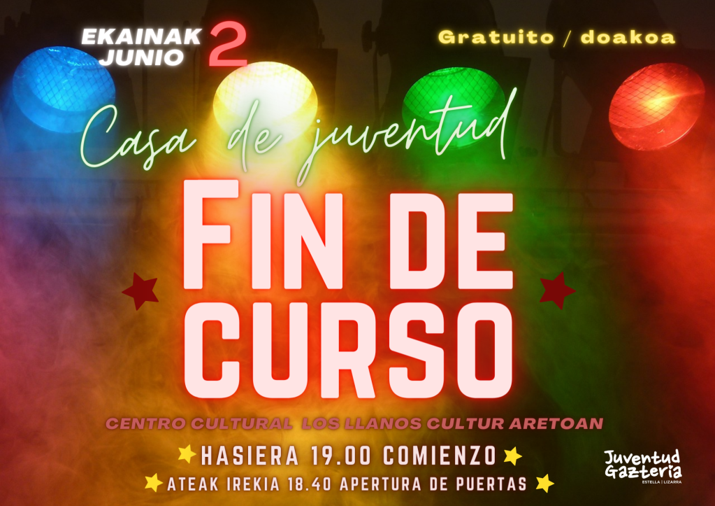 Viernes 2 de Junio: “Fiesta-Muestra Fin de Curso” de las actividades y curso organizadas por la Casa de la Juventud a lo largo del año escolar 2022-2023. Se podrá disfrutar de bailes, teatro, música, circo,..y muchas sorpresas. En la muestra participaran diferentes colectivos y jóvenes de Estella-Lizarra. El lugar será el Centro Cultural los Llanos y dará comienzo a las 19:00, siendo la entrada gratuita hasta finalizar el aforo.
