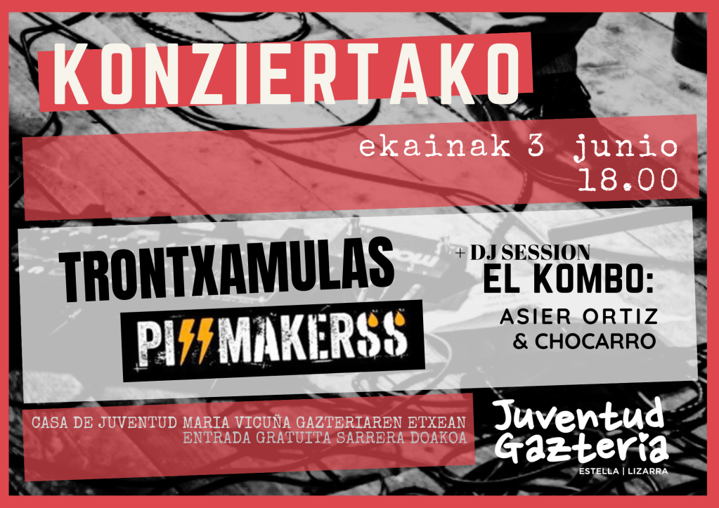 Sábado 3 de Junio: El sábado a las 18:00 en la casa de la juventud se realizara un Concierto-Djs con grupos que ensayan en la casa de la juventud. La entrada será gratuita. Los grupos participantes son TRONTXAMULAS, PISSMAKERSS +Dj EL KOMBO.