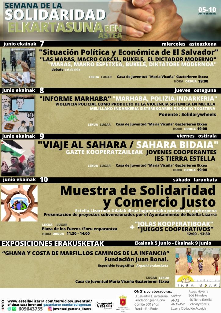 · El 10 de Junio, Sábado: En la plaza de los Fueros la Muestra de Solidaridad y Comercio Justo, de 11.30 a 14.00, con juegos cooperativos de 12:00 a 13:30 organizados por los jóvenes voluntarios que este año han cursado el curso de Monitores y Tiempo Libre en la Casa de la Juventud de Estella-Lizarra.