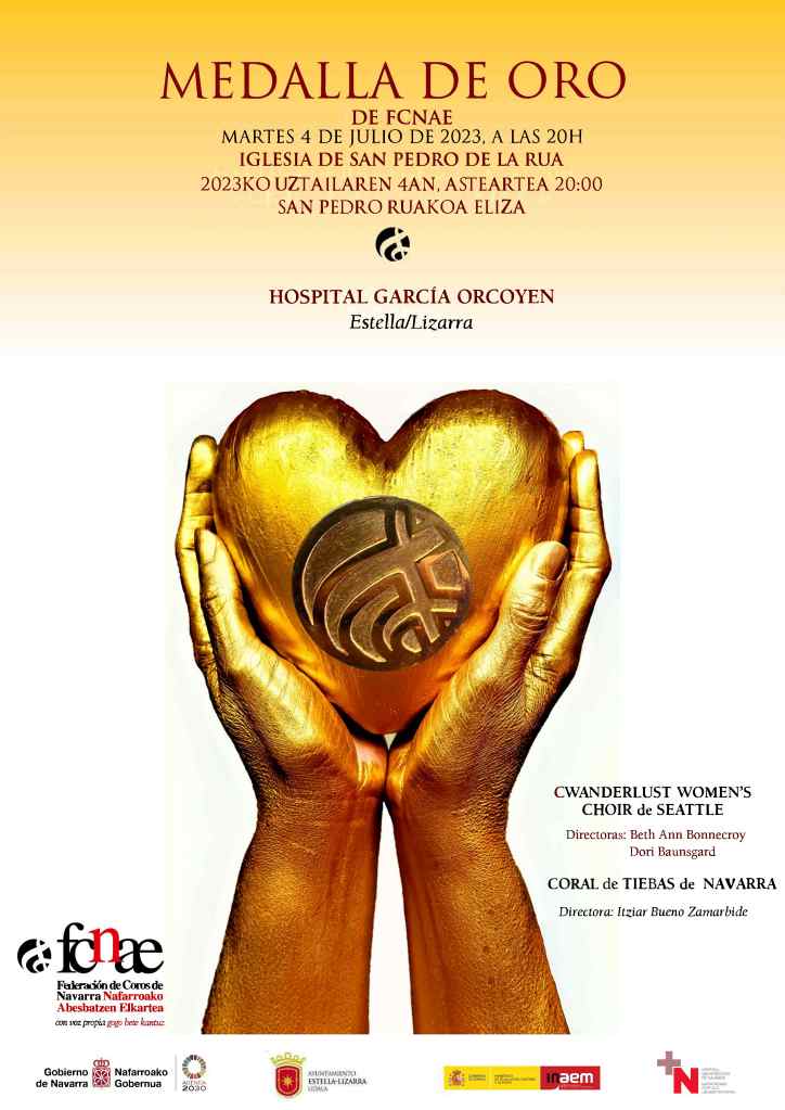 La Federación de Coros de Navarra ha organizado el próximo martes, día 4 de julio, un evento homenaje al Hospital García Orcoyen a las 20.00 horas en la iglesia de San Pedro de la Rúa. Durante el homenaje se hará entrega al centro hospitalario de la medalla de oro de la Federación y actuarán dos coros femeninos: el Coro Wanderlust Women’s Choir de Seattle (Estados Unidos), dirigido por Beth Ann Bonnecroy, y el Coro de Tiebas, que dirige Itziar Bueno Zamarbide.