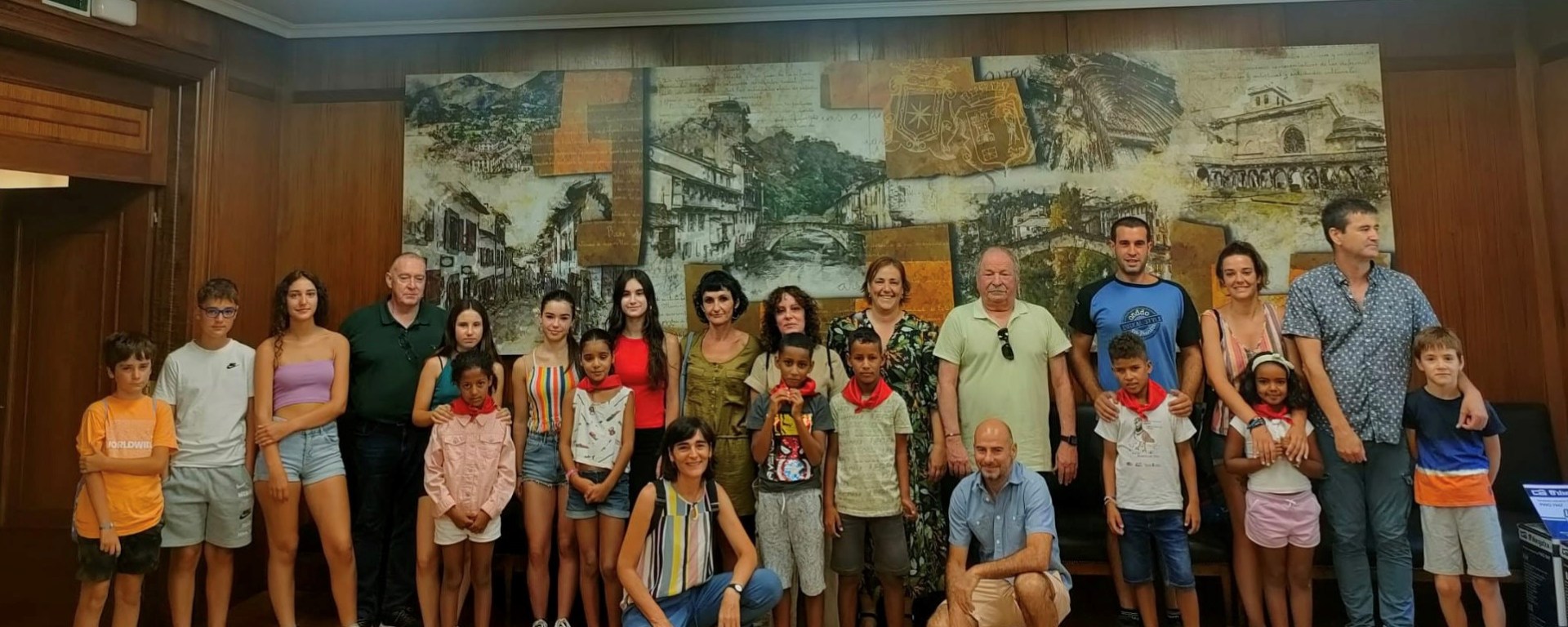 La alcaldesa, Marta Ruiz de Alda, y los concejales Santos Mauleón y Txemi Pérez de Eulate han participado en el recibimiento, imponiendo un pañuelico rojo a los menores como recuerdo, y deseándoles una feliz estancia.