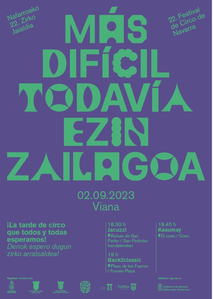 El Festival de Circo de Navarra “Más difícil todavía. Ezin zailagoa” es una cita cultural que se celebra cada año desde hace 22 años y su objetivo es impulsar el circo en sus más variadas vertientes, apostar por una programación de calidad y facilitar el acceso a la cultura de toda la ciudadanía. Todos los espectáculos son gratuitos y cualquier edad es buena para disfrutar de estas propuestas.