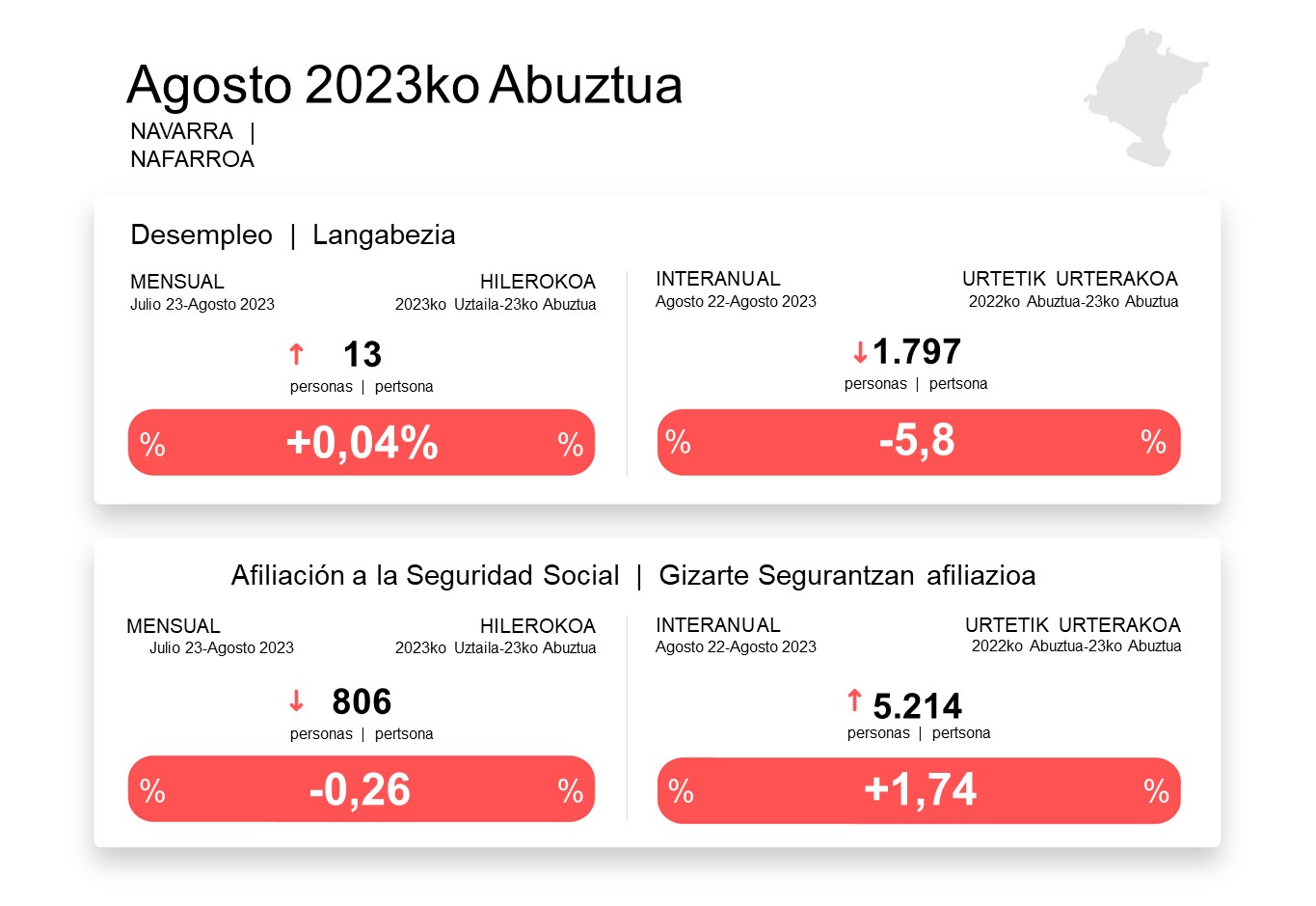 El empleo se mantiene estable en Navarra con el fin de las contrataciones de verano. Al cierre de agosto se han registrado 13 personas paradas más y un descenso medio de 806 personas en la afiliación a la Seguridad Social. Con perspectiva anual, Navarra anota un descenso del paro de casi 1.800 personas y un aumento de 5.214 cotizantes a la Seguridad Social.