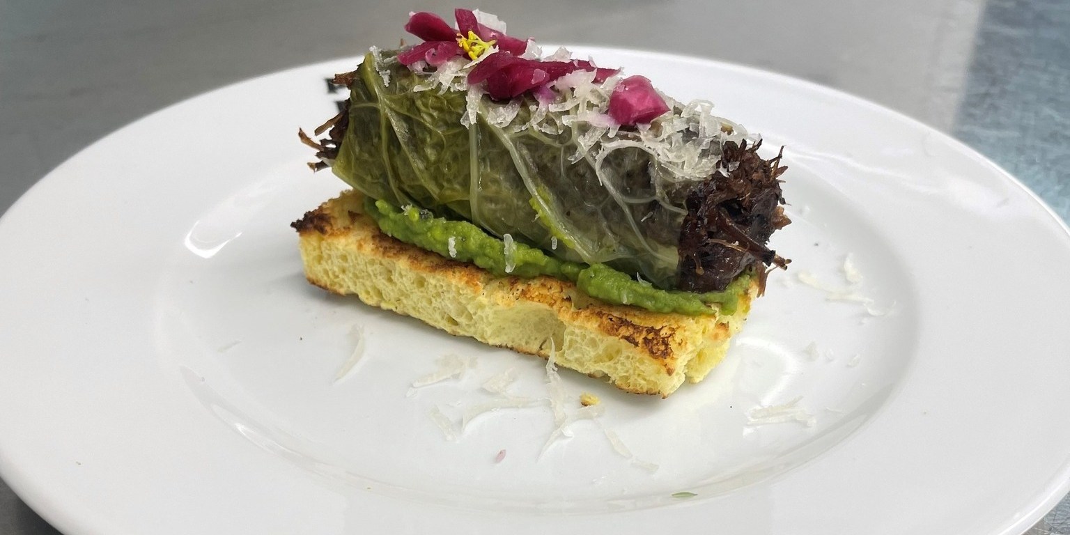 Sobre una masa de pan brioche, Iban añade un paté de haba casero, que personaliza con aroma a flor de hinojo silvestre. Sobre esa base, amarilla y verde, Iban añade un rollito de hoja de berza relleno con carrillera de vaca cocinada a fuego muy lento, en salsa de vino tinto.