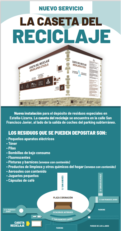 Hoy, viernes 10 de noviembre, a las 13.30 horas se va a realizar la presentación de la nueva CASETA DEL RECICLAJE, instalada en la C/ San Francisco Javier de Estella-Lizarra.