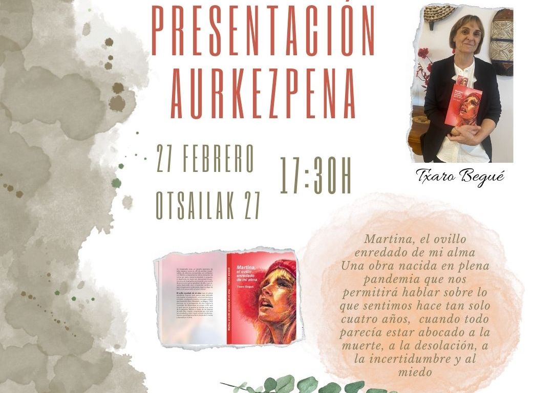 La escritora navarra Txaro Begué presentará su último libro, “Martina, el ovillo enredado de mi alma” en la biblioteca de Ayegui el próximo martes 27 de febrero a las 17:30. La obra, que no es una novela al uso, fue escrita en plena pandemia y cuenta la relación entre una madre y su hija, mezclando prosa y poesía.