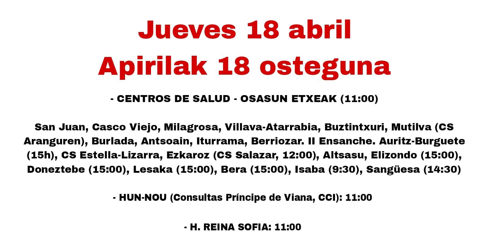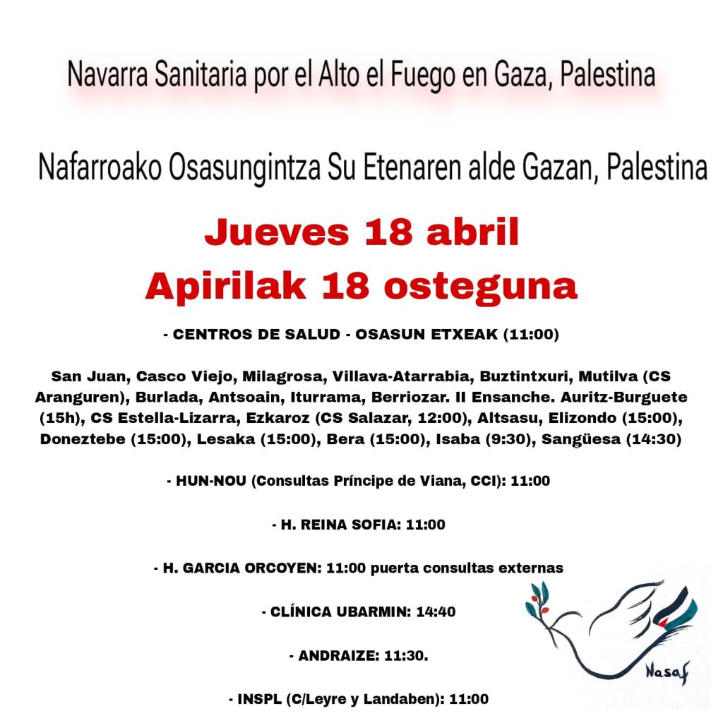 Este jueves 18 de Abril, a las 11h tanto en el Hospital García Orcoyen de Estella , como en el Centro de Salud, vuelven a convocarse sendas concentraciones exigiendo el alto el fuego en Gaza. La convocatoria surge de la plataforma Navarra Sanitaria por el alto el fuego.