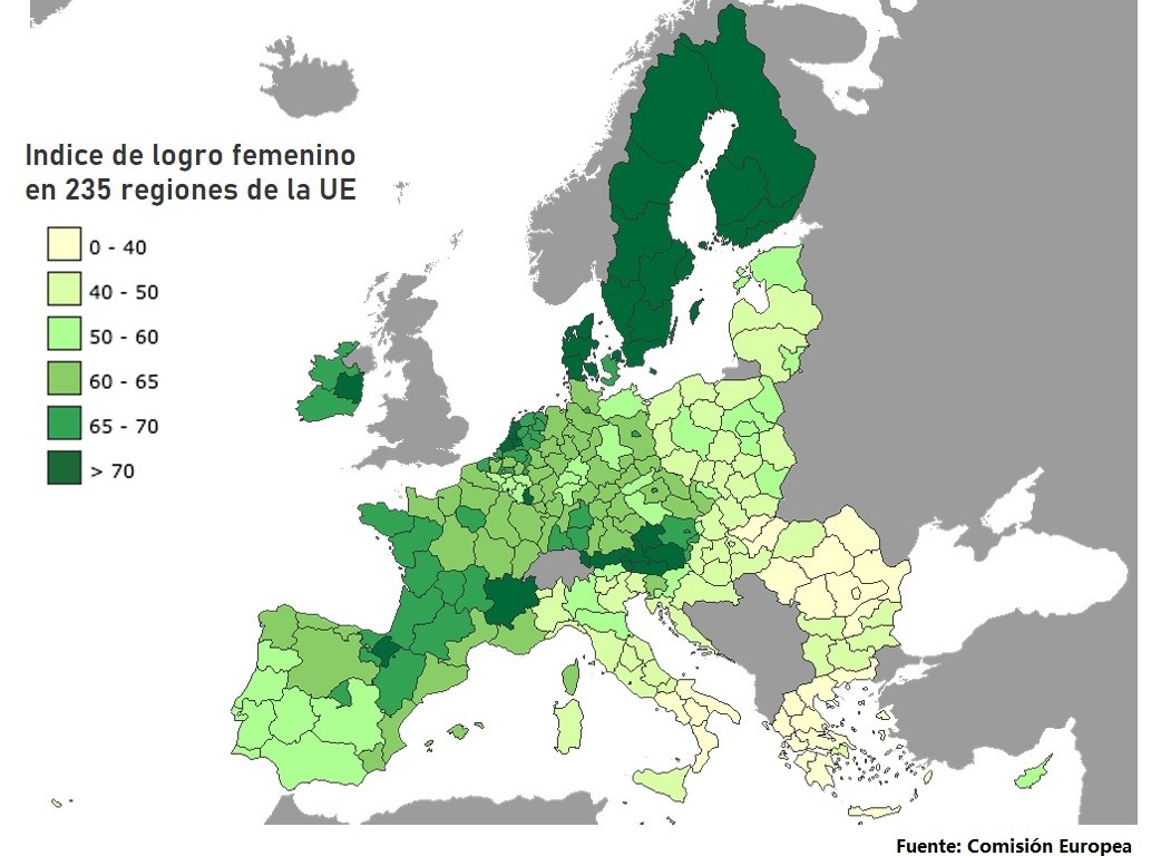 La región europea en la que se sitúa el nivel más alto de logros femeninos alcanzados es Helsinki-Uusimaa, en Finlandia. Por el contrario, el más bajo se sitúa en Rumania, en la región Sed-Est.