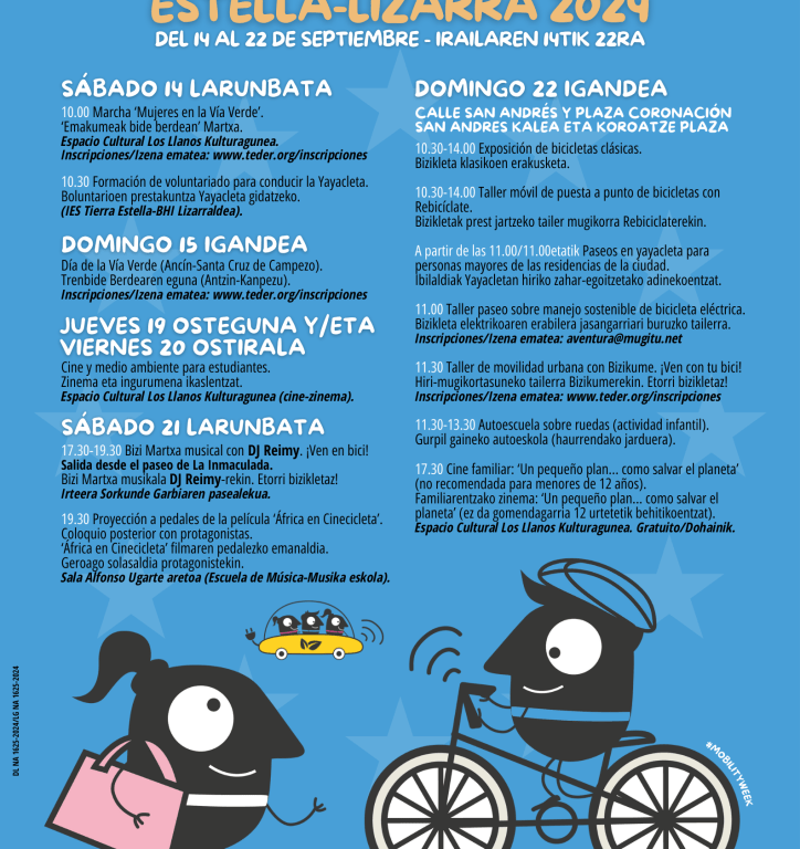 El Ayuntamiento de Estella-Lizarra ha vuelto a sumarse un año más a la Semana Europea de la Movilidad, del 16 al 22 de septiembre, con un extenso programa realizado en colaboración con Teder, Asociación del Ferrocarril Vasco Navarro, IES Tierra Estella y el apoyo de Gobierno de Navarra.