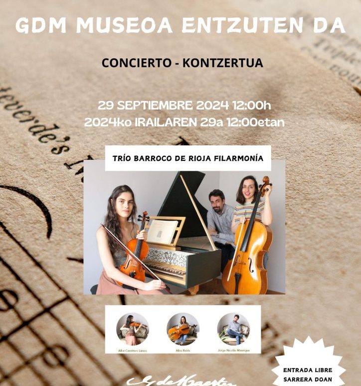 Será este domingo día 29 de septiembre con Trío Barroco de Rioja Filarmonía. Desde el mes de septiembre hasta diciembre de 2024 el Museo Gustavo de Maeztu «sonará» con un ciclo de conciertos musicales dirigidos por el músico y saxofonista, Fernando Sánchez. Este ciclo de conciertos forma parte de la programación anual del museo que lleva por título «El museo GDM suena» Con esta programación … Continúa leyendo El Museo Gustavo de Maeztu presenta un concierto en homenaje a Fray Diego de Estella en el V Centenario de su Nacimiento