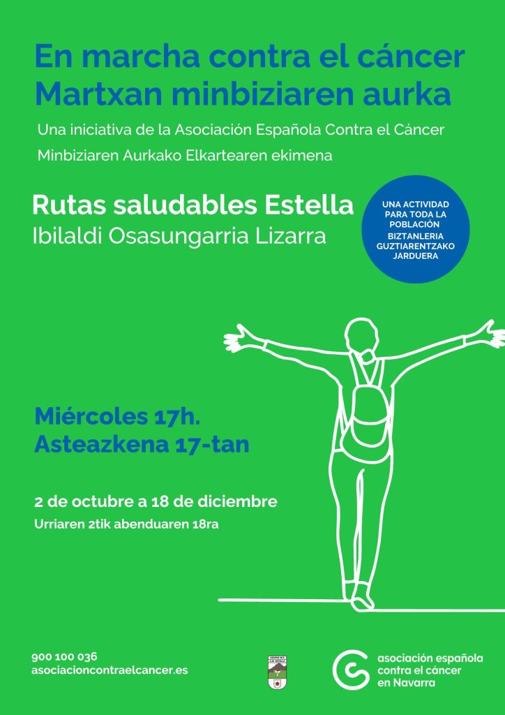 Las rutas saludables son una forma de generar un espacio de actividad física y periódica en compañía. Son recorridos de 60 minutos, aproximadamente, un día a la semana en grupos reducidos dinamizados por personas voluntarias de la Asociación Española Contra el Cáncer en Navarra. Las rutas de este último trimestre del año comienzan el próximo día 2 de octubre.