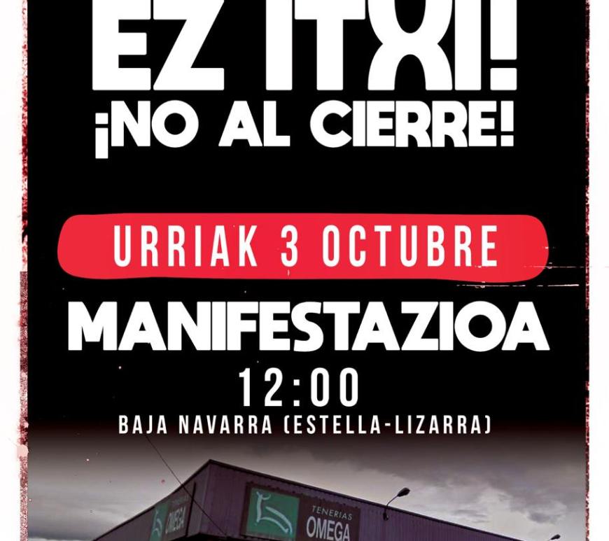 Los trabajadores y trabajadoras de la factoría Tenerías Omega de Villatuerta se manifestarán mañana (3 de octubre) en Estella en contra del cierre de la empresa. La manifestación saldrá a las 12:00 de la calle Baja Navarra; un poco antes de comenzar representantes de la plantilla realizarán declaraciones a los medios que así lo deseen. Continúa leyendo No al cierre de Tenerías Omega