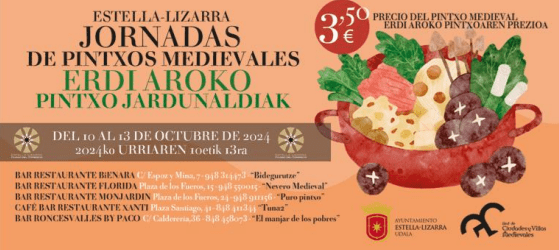 La Asociación de Comerciantes, Hostelería y Servicios de Estella-Lizarra, organiza una jornada de pintxos medievales, que se desarrollarán del 10 al 13 de octubre de 2024, en cinco establecimientos de hostelería de la ciudad.