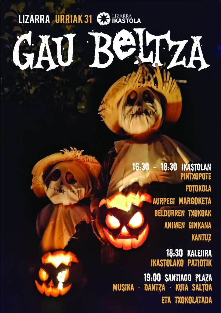 Lizarra Ikastola organiza, un año más, su esperada Gau Beltza el próximo 31 de octubre, una tarde y noche mágica llena de tradición y misterio. Desde las 16:30 horas, el patio del centro será el epicentro de actividades que invitan a todos y todas a disfrutar y participar en esta celebración. Habrá pintxopote, un photocall temático, pintacaras, y rincones donde los más pequeños podrán enfrentarse a sus miedos en una gincana del terror. A las 18:30 horas, la kalejira partirá desde la Ikastola para recorrer las calles de Lizarra.