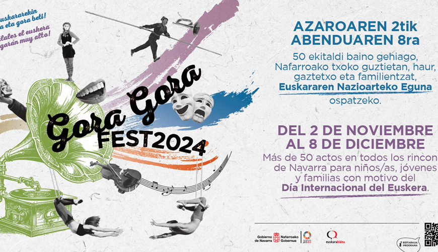 El programa de la IV edición del ciclo cultural, organizado por Euskarabidea, incluye diferentes obras de teatro, cuentacuentos y espectáculos de danza entre otros Con motivo del Día Internacional del Euskera, que se celebra el próximo 3 de diciembre y coincide con el día de Navarra, Euskarabidea – Instituto Navarro del Euskera ha organizado la 4ª edición del ciclo cultural ‘Gora-Gora Fest! 2024’. El ciclo ha sido … Continúa leyendo El festival ‘Gora Gora Fest!’ llega este año a 55 localidades navarras con una variada oferta cultural en euskera