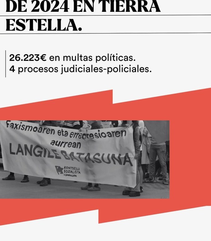 26.223€ en multas de contenido político a lo largo del año 2024 en Lizarraldea (principalmente Lizarra) a diferentes organizaciones e individuos. Ese es el balance de pura represión económica que hemos recogido en nuestra zona. La tan cacareada convivencia se fundamenta en una constante presión sobre todo aquello que se sale del tiesto. Multas que van desde llevar una pegatina, colocar un cartel, protestar por … Continúa leyendo 26.223, 4 Y 2, por Iosu Dufur