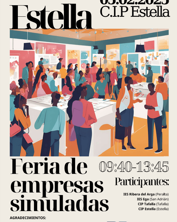 El miércoles 5 de febrero se va a celebrar en el Frontón del CIP de Estella la Feria de Empresas Simuladas. Es un evento que simula una Feria Empresarial (como, por ejemplo, Ferroforma en el Bilbao Exhibition Center) en el que el alumnado participa con stands de sus propias empresas simuladas y ofrecen sus productos/servicios, negocian con otras empresas, llegan a acuerdos y formalizan operaciones de compraventa. Todo ello simulado, por supuesto.