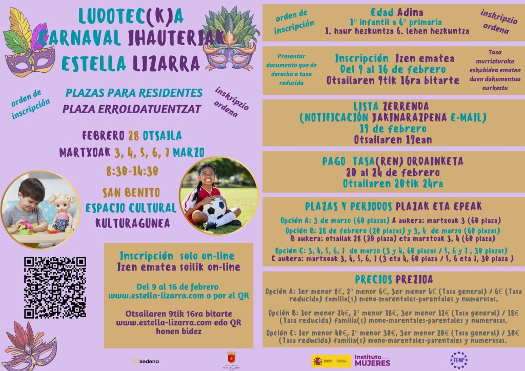 El Ayuntamiento de Estella-Lizarra, a través del Área de Igualdad, va a ofertar el servicio de ludoteca un año más por Carnaval. Estará en funcionamiento los días 28 de febrero, 3, 4, 5, 6 y 7 de marzo en San Benito. Las inscripciones se podrán realizar on-line del 9 al 16 de febrero en el siguiente enlace: https://www.estella-lizarra.com/preinscripcion-ludoteca-carnaval-2025-2025eko-inauterietako-ludotekarako-aurreinskripzioa/ Más información en el enlace.