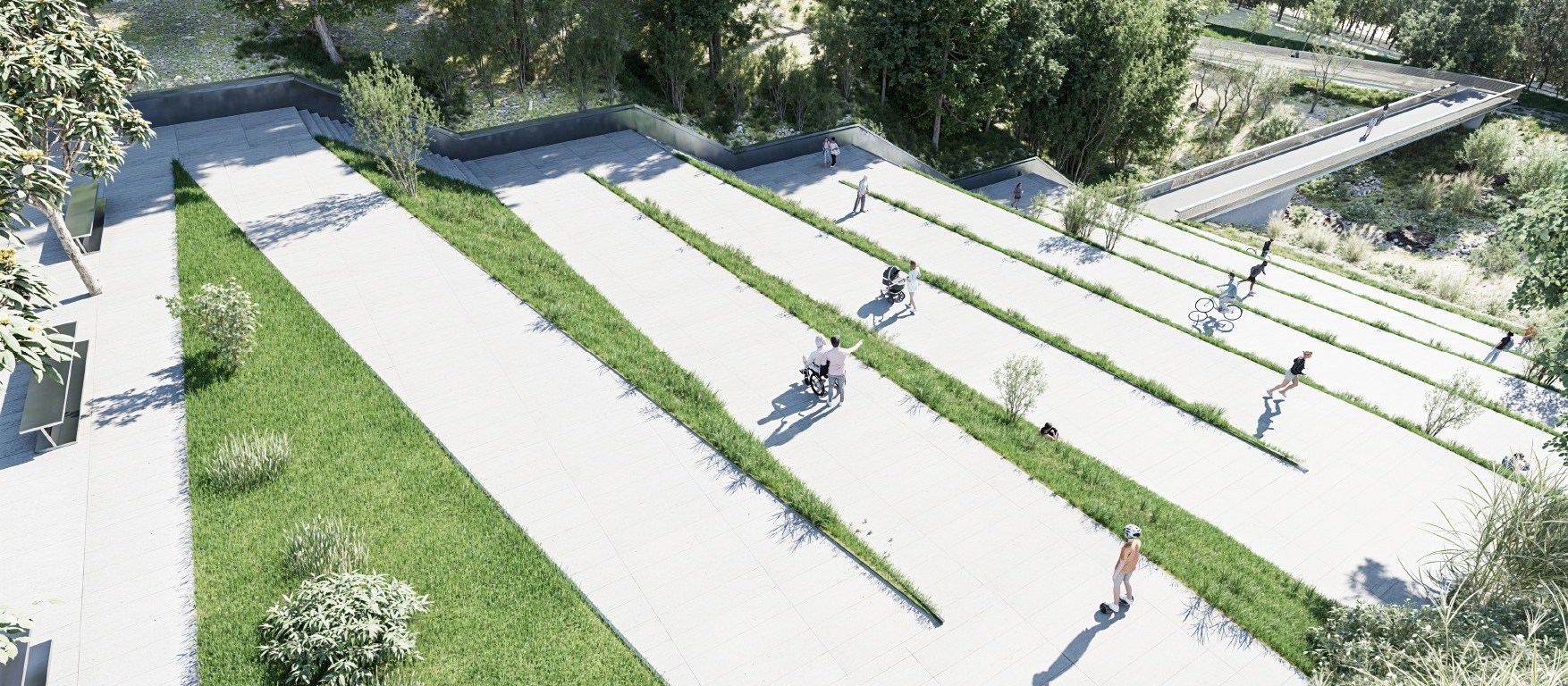Lo que propone el equipo ganador es la construcción de una pasarela que culmina al otro lado del río con una estructura en zigzag más unas escaleras para salvar el desnivel con cualquiera de esas dos opciones. De esta forma, se podrá circular tanto a pie como en bici, con carros de bebé, patines, etc. Para hacerlo más amable se propone habilitar entre los tramos de zigzag zonas ajardinadas.