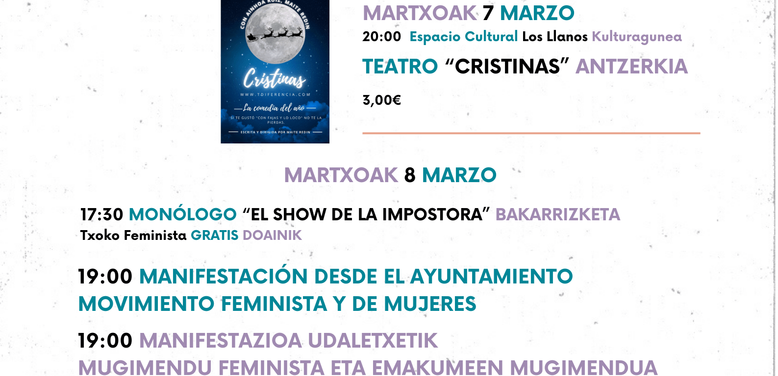 · 8 de marzo, 17.30 – Monólogo ‘La reina de la fiesta. El show de la impostora’ en el Txoko Feminista. Una reflexión en clave de humor sobre la precariedad laboral de las mujeres en el mundo del espectáculo. Entrada gratuita.