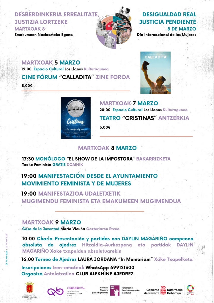 · 8 de marzo, 19.00 – Manifestación convocada por el Movimiento Feminista y de Mujeres de Estella-Lizarra. Salida desde el ayuntamiento.