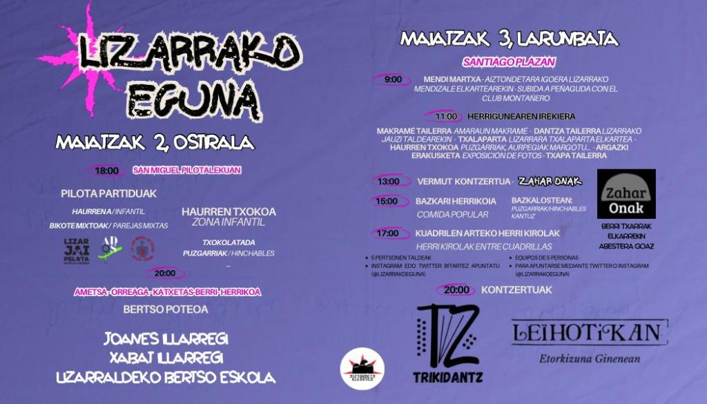 La comunidad, el pueblo, la gente es la única protagonista. Y eso lo reivindicamos y lo celebramos. Los días 2 y 3 de mayo volveremos a celebrar el “Lizarrako eguna” con el objetivo de celebrar y reivindicar esos valores que impregnan todos los rincones y txokos físicos y emocionales de nuestra ciudad y de su gente. “Herritik, herriagatik eta herriarentzat” vuelve a ser el lema elegido para este año. “Desde el pueblo, por el pueblo y para el pueblo”, creemos que resume a la perfección el día a día de colectivos y personas de Lizarra que convierten su actividad en el latido de la ciudad.