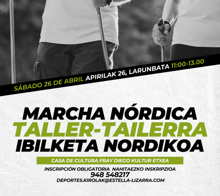 El Área de Deporte y Salud del Ayuntamiento de Estella-Lizarra ha organizado para el próximo 26 de abril, sábado, un taller gratuito de marcha nórdica pra mujeres en horario de mañana. Habrá una parte teórica en la Casa de Cultura y posteriormente una salida por la ciudad. El horario será de 11.00 a 13.00 horas. Inscripciones en el 948 548217 y en deportes.kirolak@estella-lizarra.com Plazas limitadas. Continúa leyendo Taller de marcha nórdica para mujeres