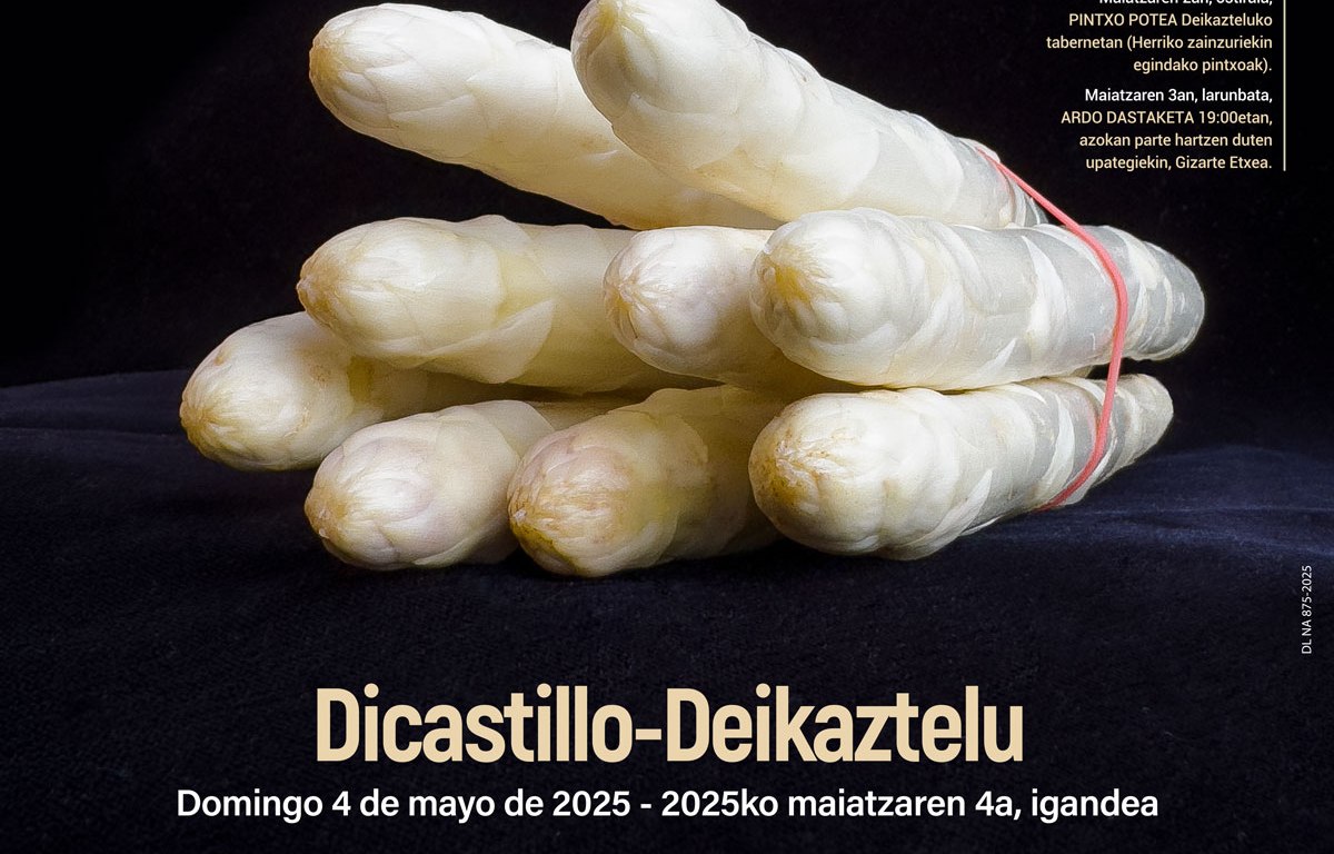 12:00 Degustación de espárrago fresco de Dicastillo, un producto excepcional que se cultiva en las fincas del municipio. En el frontón de la Calle Rebote se repartirán 2.000 raciones de espárrago blanco, aliñadas con aceite local del Trujal Mendia, de Arróniz.