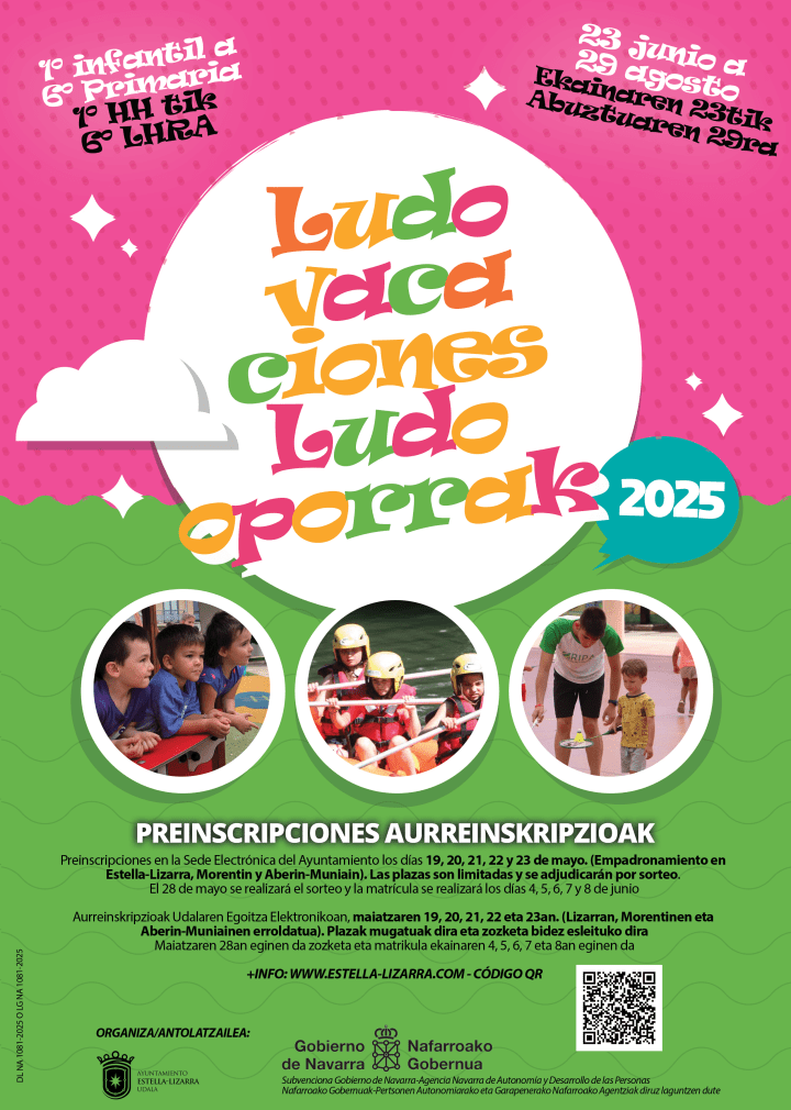 El próximo lunes, día 19 de mayo, se abre el plazo de preinscripción para las Ludovacaciones de Verano que cada año organiza el Ayuntamiento de Estella-Lizarra para escolares que han cursado entre 1º de Infantil y hasta los 11 años. La solicitud se deberá realizar vía on-line a través de la Sede Electrónica y se podrá formalizar hasta el día 23 de mayo para los y las menores empadronados en Estella-Lizarra, Morentin y Aberin-Muniáin.
