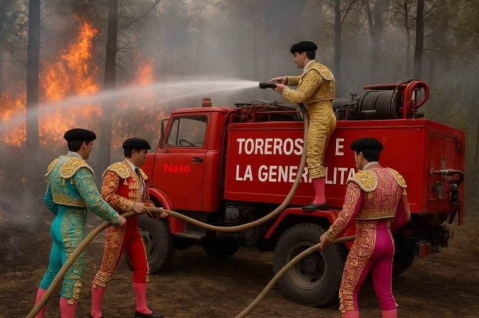 Dónde están los toreros, no los veo apagando fuegos, tampoco veo a los macarras de vox, ni de desocupa, ni a Vito Quiles en medio de las llamas con una manguera, ni por supuesto a fachascal que tiene la desfachatez de aparecer diez días después despotricando y metiendo su odio en el mismo saco el terrorismo, el cambio climático, y todo lo que se le pueda ocurrir para meter mierda.