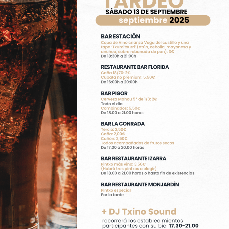 Seis establecimientos de hostelería de la ciudad se han sumado a un Tardeo Especial que habrá este sábado, día 13 de septiembre, en la ciudad organizado por el Ayuntamiento en colaboración con la Asociación de Comerciantes, Hostelería y Servicios. Cada establecimiento ha preparado su propia promoción y además DJ Txino Sound animará con su bicicleta la ciudad recorriendo los establecimientos participantes.